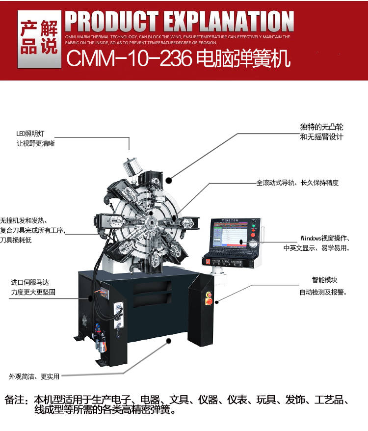 獨特的無凸輪和無搖臂設計,由6組伺服馬達獨立控製,可以生產各種各樣異型彈簧、壓簧、雙扭簧、電池簧、扁簧(發條簧)及各種線成型等。精密(mì)準確、調機快(kuài)速、穩定可靠。